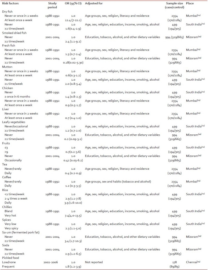 Five case-control studies and no cohort studies have been published from India in the last 10 years to establish specific dietary and lifestyle habits in relation to gastric cancer. The limited number of studies may be due to the difficulties in measuring the exposure by developing food frequency questionnaire and in preparing nutritional data base.