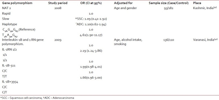Only six studies are reported from India on genetic polymorphism and development of gastric cancer [Table 8]. Malik et al. have found GSTM1null and CYP2E1c1c2 genotypes imparted risk for gastric cancer [OR=1.98 (95% CI=1.22-3.21) and OR=2.26 (95% CI=1.25-5.25)] in population from Kashmir valley.[37] Another study has stated that GSTT1 null genotype increases the risk of gastric cancer.[38] Prasad et al. have stated that combination of G carrier and H. pylori infection increased the risk of gastric adenocarcinoma [OR=3.504, (95% CI=1.195-7.0807)].[39] Another study from Northern India has indicated the risk of gastric adenocarcinoma was significantly higher in patients having C carrier and H. pylori infection [OR=7.06, (95% CI=2.61-19.09)].[40]