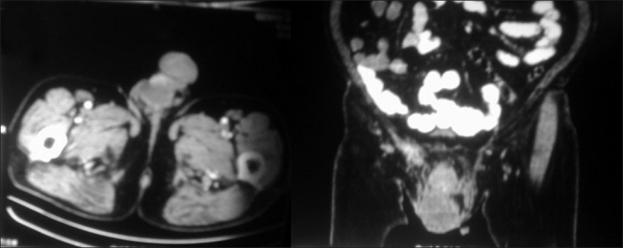 | Fig. 1 (a)Testicular plasmacytoma CT scan axial section preoperative picture showing right testicular mass. b: Testicular plasmacytoma CT scan coronal section preoperative picture showing right testicular mass