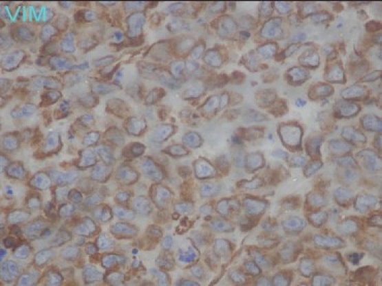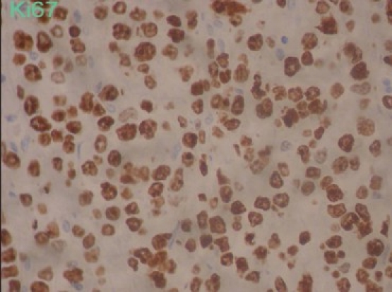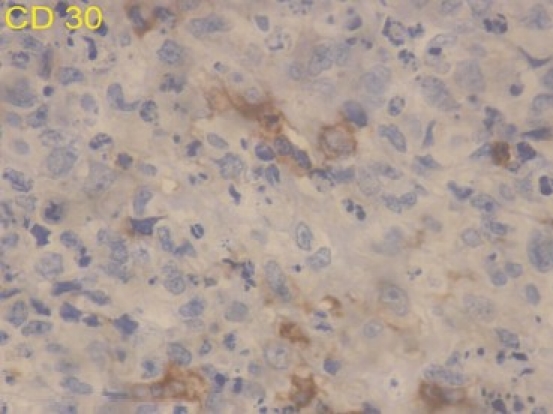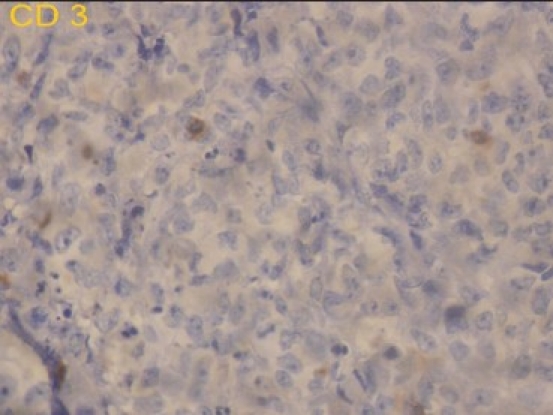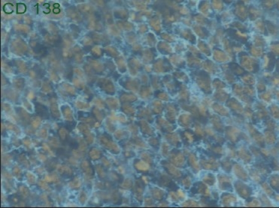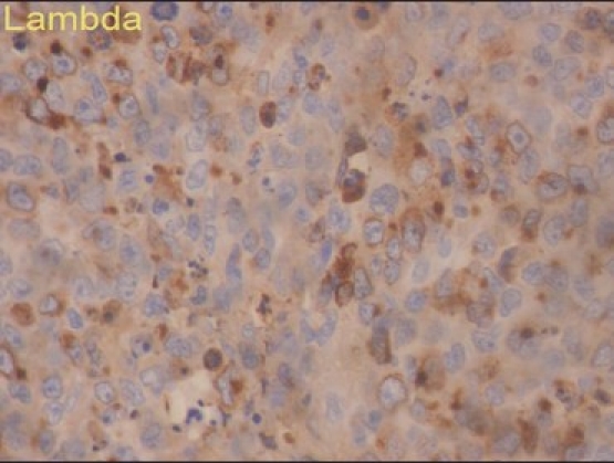 On examination, performance status according to Eastern Cooperative Oncological Group[2] , Scoring was 2; all the vital parameters were normal. Local examination revealed a 10×15 cm tense, firm, and tender swelling involving the right scrotum. On palpation, the swelling was not reducible. One could get above the swelling. Testicular sensation was lost on the left side. The opposite side testis was normal. A computed tomography scan of the abdomen and pelvis showed heterogeneous soft tissue right testicular mass, which was measuring 10×6×5 cm in size with some evidence of necrosis within the right testicles and there were right inguinal lymph nodes [Figure 1]. At this time, the differential diagnosis was infected hydrocele/pyocele or organized hematoma was entertained. Preoperatively complete blood count, serum biochemistry, and thyroid function tests were normal; viral serology (retroviral and Epstein bar virus) was negative. Beta human chorionic gonadotropin and alpha-fetoprotein values were normal. Hence, he was taken up for surgery. Per-operatively, he seemed to have tumor testes infiltrating the scrotal wall. Therefore, high orchidectomy with excision of hemiscrotum was done. The opinions from four different pathologists were sought. The histopathology gave a differential diagnosis of testicular tumor with scrotal sac wall infiltration/diffuse large cell non-Hodgkins immunoblastic/anaplastic lymphoma; poorly differentiated carcinoma in favor of embryonal carcinoma; poorly differentiated malignant tumor most consistent with plasmacytoma. Immunohistochemistry showed Vimentin, CD30, CD 138 Lambda chains positive, increased Ki 67, EMA, CD79a, S100P positive, in favor of anaplastic plasmacytoma [Figures 2 ((aa–k) and 3 ((aa–i)]. EBER, cyclin D1, MiB1, and CD 56 were not done due to logistic reasons. In the meanwhile, workup for MM was done, which showed normal serum electrophoresis and β2 microglobulin level. Urine was negative for Bence Jones protein. Tc99m Bone scan and bone marrow reports were normal. After a lapse of 2 months due to the diagnostic dilemma, treatment was started for plasmacytoma with daily tab – thalidomide 100 mg weekly tab, dexamethasone 40 mg daily tab, melphalan 5 mg twice daily for 5 days. The patient has completed six cycles of chemotherapy and is in remission.