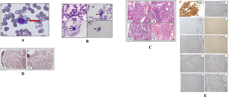 Fig 1: (A) PB smear (×100). Lymphocytosis with many reactive and some atypical forms, the figure shows an atypical—spindle-shaped—lymphoid cell. (B) Bone marrow aspirate (Wright stain, ×100) BM with infiltrated approximately 80% atypical lymphoid cells; small to medium-sized with occasional nucleoli, cytoplasmic blebs/spindle shaped (a) and/or vacuolations (b, c), and some showed fried-egg like morphology (d). (C) Bone marrow trephine biopsy (H&E stain). (D) BM trephine biopsy reticulin special stained slides showing normal pattern of reticulin fibers (Grade 0–1 MF). (E) BM trephine biopsy immuno-stained slides showing strong diffuse positive CD20, partial positive BCL2 and annexin A1, with negative CD3, CD5, CD23, CD10, cyclin D1 and BCL6.