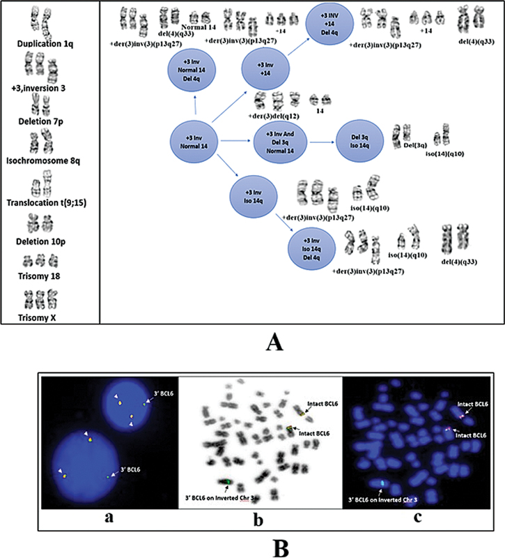 We identified a novel double-hit mechanism involving the BCL6 gene, with the presence of two distinct divergent BCL6-abnormal clones within a complex karyotype. One clone harbored an extra copy of derivative chromosome 3 with inv(3)(p13q27), leading to an atypical BCL6 rearrangement with 5′ deletion, while the other showed a 3q deletion encompassing the BCL6 locus with a separate pathogenic tumor suppressor mechanism. The karyotype revealed clonal evolution from a complex stemline clone of extra copy of chromosome 3 with inversion, 1q duplication, isochromosome 8q, deletions of 7p and 10p, a derivative chromosome 9 resulting from t(9;15) and 9p deletion, trisomy 18, and trisomy X. As illustrated in the figure ([Fig. 2A]), subclonal trajectories evolved from this stemline to acquire additional aberrations such as 3q deletion, trisomy 14, isochromosome 14q, trisomy 14 and 4q deletion reflecting genetic instability.