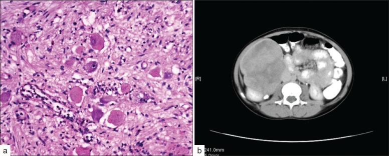 | Figure 1 (a) Spindle shaped cells intermixed with mature ganglion cells (b) A large heterogenously enhancing mass apparently arising from the interpolar region of the right kidney extending towards the lower poleShe was taken up for laporatomy. Intraoperative findings revealed a retroperitoneal mass with nodular projections, densely adherent to the anterior surface of the right kidney, encasing the right renal vessels and extending to the IVC. The mass was carefully and completely dissected out with a 2.5 cm portion of the IVC, which was repaired. The histopathological examination was suggestive of GN [Figure 1b].