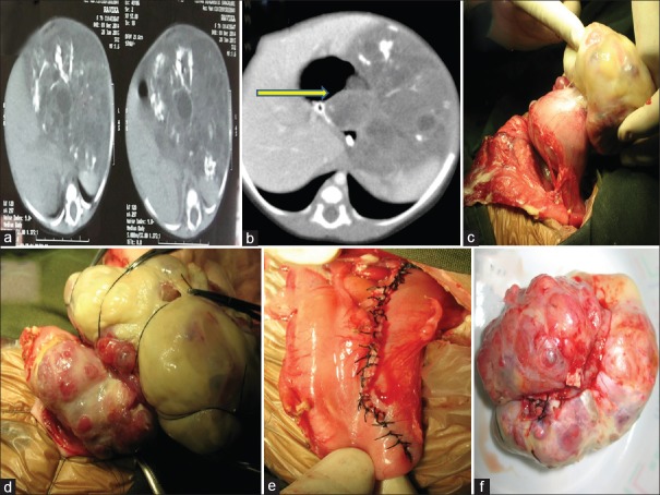 | Figure 1:(a) Computed tomography scan picture of mature gastric teratoma with areas of chunky calcifications. (b) Computed tomography scan picture of immature gastric teratoma showing heterogeneous tumor with specks of calcification; yellow-colored arrow pointing at intragastric component. (c) Ruptured immature gastric teratoma with slough over the surface, arising from anterior wall of stomach. (d) Intraoperative picture showing intragastric component. (e) Suture line after complete excision, extending from gastroesophageal junction to antrum. (f) Excised gastric teratoma