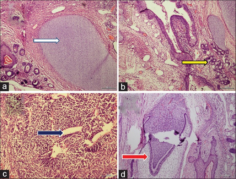 | Figure 2:Histopathological examination pictures in low power view. (a) Mature gastric teratoma showing skin and adnexal tissue. White-colored arrow pointing at cartilaginous tissue. (b) Mature gastric teratoma showing endodermal derivatives, i.e., glands and mesenchymal derivatives such as cartilaginous tissue. Yellow-colored arrow pointing at the multiple mucinous glands. (c) Immature gastric teratoma-low power view showing multiple tubular structures lined by primitive neuroepithelium. Blue-colored arrow pointing at a tubular structure lined by neuroepithelium. (d) Red-colored arrow pointing dentine epithelium suggestive of immature gastric teratoma