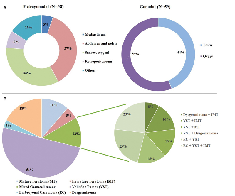 | Fig 1 : (A) Anatomical distribution of gonadal and extragonadal germ cell tumors. (B) Distribution according to histopathology.