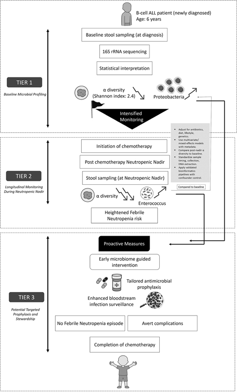 Fig 1: Hypothetical application of the three-tiered gut microbiome framework in a pediatric ALL patient. A 6-year-old child with newly diagnosed B-cell ALL undergoes baseline stool sampling (Tier 1), revealing low α diversity (Shannon index 2.4) and increased Proteobacteria abundance, prompting flagging for intensified monitoring. During induction chemotherapy, stool analysis at neutropenic nadir (Tier 2) demonstrates further decline in microbial diversity and Enterococcus overgrowth. Based on these findings, Tier 3 interventions including tailored antimicrobial prophylaxis and enhanced surveillance for bloodstream infections are implemented. The patient completes chemotherapy without febrile neutropenia episodes, illustrating how early, microbiome-guided interventions may potentially prevent infectious complications. ALL, acute lymphoblastic leukemia.