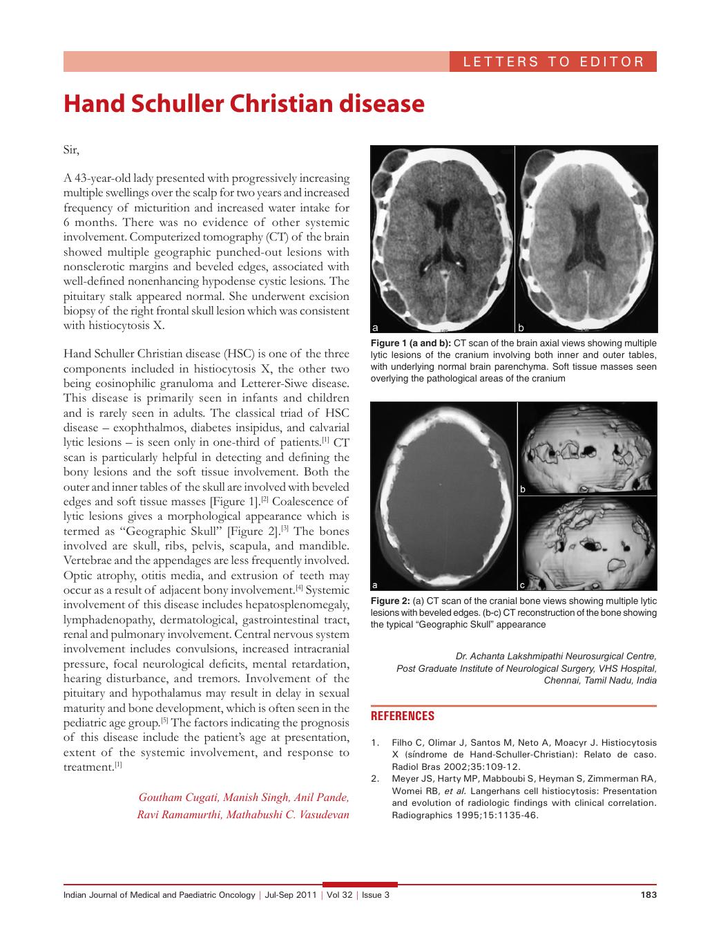 Hand Schuller Christian disease (HSC) is one of the three components included in histiocytosis X, the other two being eosinophilic granuloma and Letterer-Siwe disease. This disease is primarily seen in infants and children and is rarely seen in adults. The classical triad of HSC disease – exophthalmos, diabetes insipidus, and calvarial lytic lesions – is seen only in one-third of patients.[1] CT scan is particularly helpful in detecting and defining the bony lesions and the soft tissue involvement. Both the outer and inner tables of the skull are involved with beveled edges and soft tissue masses [Figure 1].[2] Coalescence of lytic lesions gives a morphological appearance which is termed as “Geographic Skull” [Figure 2].[3] The bones involved are skull, ribs, pelvis, scapula, and mandible. Vertebrae and the appendages are less frequently involved. Optic atrophy, otitis media, and extrusion of teeth may occur as a result of adjacent bony involvement.[4] Systemic involvement of this disease includes hepatosplenomegaly, lymphadenopathy, dermatological, gastrointestinal tract, renal and pulmonary involvement. Central nervous system involvement includes convulsions, increased intracranial pressure, focal neurological deficits, mental retardation, hearing disturbance, and tremors. Involvement of the pituitary and hypothalamus may result in delay in sexual maturity and bone development, which is often seen in the pediatric age group.[5] The factors indicating the prognosis of this disease include the patient's age at presentation, extent of the systemic involvement, and response to treatment.[1]