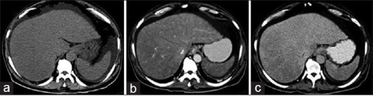 Esophagogastroduodenoscopy showed Grade-2 esophageal varices with gastropathy and duodenopathy. Computerized tomography (CT) abdomen with contrast [Figure 1], showed hepatomegaly with heterogeneous hepatic parenchymal enhancement with areas of hypodense areas in portal venous phase, homogenizing on delayed images (3 min); nonopacification of the right, middle, and left hepatic veins. Splenomegaly with moderate ascites. The diagnosis of Budd–Chiari syndrome was considered.