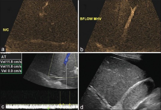 | Figure 2:Ultrasound liver with Doppler showing, (a) B-flow imaging showing patent inferior vena cava and left hepatic veins, (b) patent middle hepatic flow, (c) color Doppler images of the right hepatic veins showing hepatofugal patent flow with attenuated phasicity, (d) ultrasonography of liver showing heterogenous echotexture of parenchyma with ascites and cholestasis