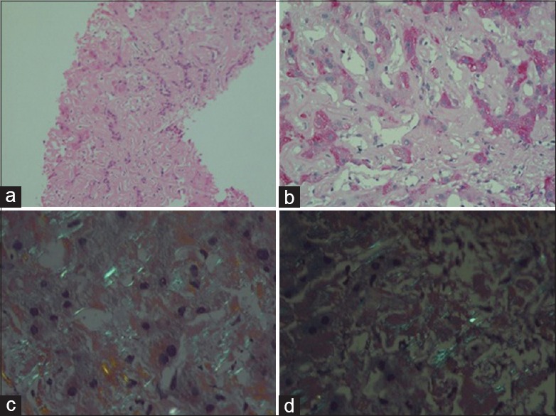 | Figure 3:(a) Liver tissue showing amorphous eosnophilic material in the sinusoids (H and E, ×100), (b) faint periodic acid-Schiff-positive material in the sinusoids (×200), (c) apple green birefringence on polarizing microscopy of Congo red stain (×400), (d) congophilia persists after treatment with KMnO4 (×400)