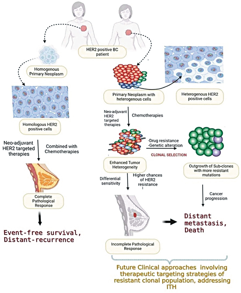 Fig 2 : Human epidermal growth factor receptor 2 (HER2) heterogeneity in breast cancer and its impact on therapy and disease progression.