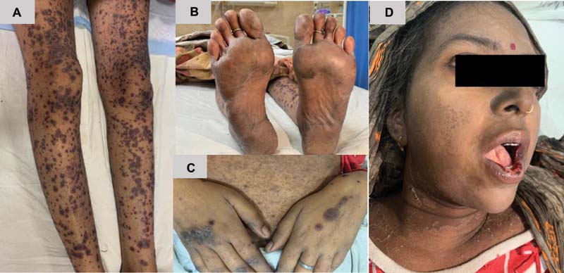 | Figure 1:(A) Pruritic plaques on an erythematous base, (B) plantar erythrodysesthesia, (C) hyperkeratotic plaques over dorsum of hand, (D) oral mucositis and facial skin in healing stage with peeling of epidermis.