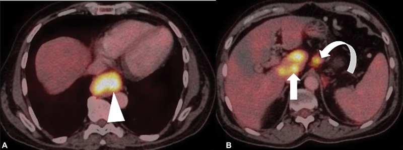 | Figure 4:(A and B) Staging of esophageal cancer on fluorodeoxyglucose-positron emission tomography/computed tomography (FDG-PET/CT) images reveals moderately FDG-avid primary esophageal mass lesion (arrowhead) with extensive FDG-avid metastatic abdominal nodes (curved arrow) and multifocal hypermetabolic hepatic (metastatic) lesions (arrow) implying M1