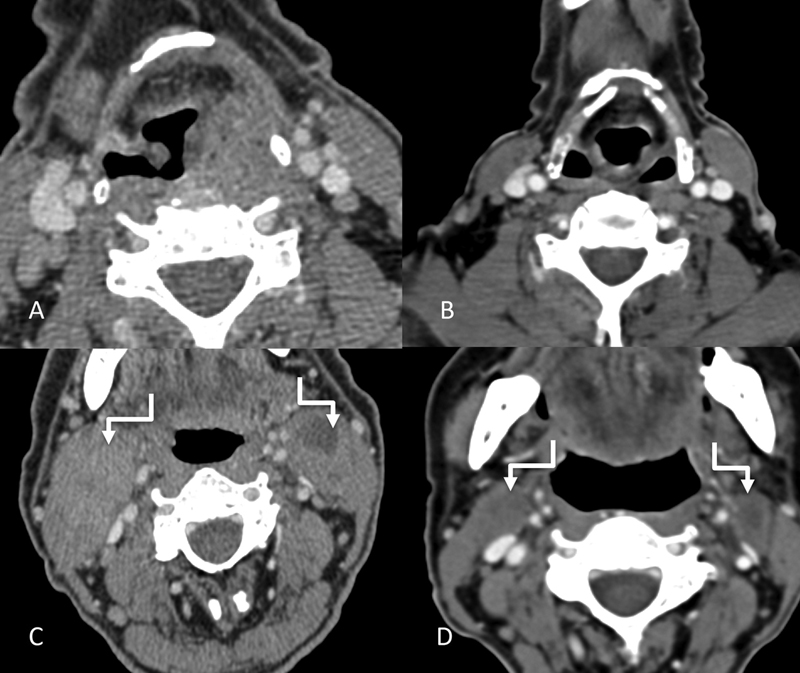 | Figure 14:Pre-chemotherapy (A and C) and post chemotherapy (B and D) imaging of the previously shown pyriform sinus cancer. Post chemotherapy axial CT images (B and D) showing near complete resolution of the primary mass and the metastatic bilateral level II nodes (shouldered arrows).