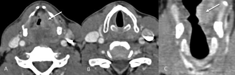 | Figure 4:Supraglottic laryngeal cancer. Axial and coronal CT images (A, C) showing a heterogeneously enhancing lesion (straight arrows) involving the left false vocal cord. The true vocal cords are normal in appearance and not involved as shown by the other axial image (B).