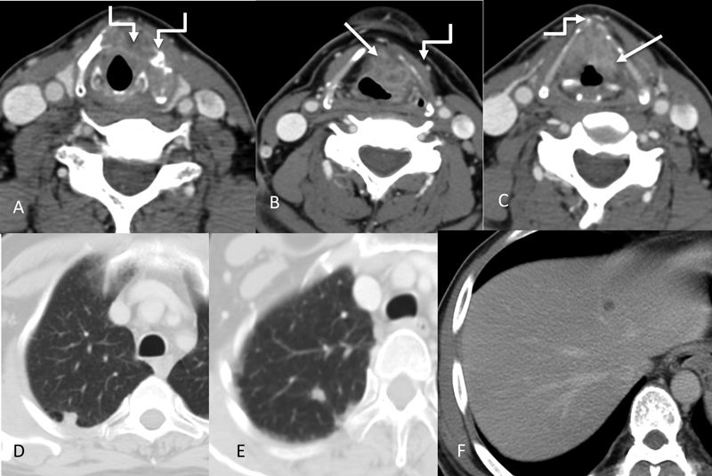 | Figure 9:Transglottic laryngeal cancer. Axial CT images (A–C) showing the primary enhancing mass (straight arrows) involving the true vocal cords bilaterally and left false cord. There is gross involvement of the thyroid cartilage (more on the left side) with subtle extralaryngeal spread anteriorly (shouldered arrows). Right arytenoid cartilage appears sclerosed. The left para glottic space is also involved. In addition, lung nodules and liver lesions were also identified (D–F).