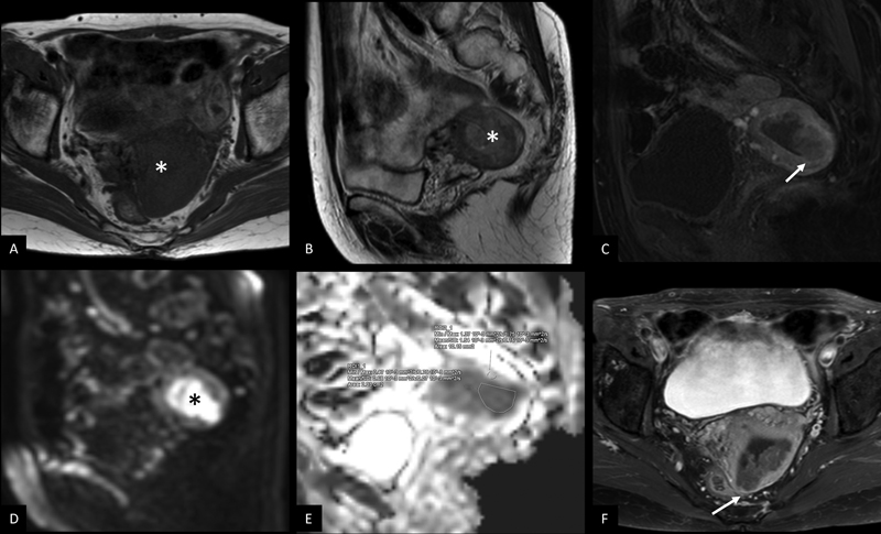 | Figure 5:Contrast enhanced MRI of leiomyosarcoma of uterus (stage IV A). T1 axial (A) and T2 sagittal (B) images show a large, ill-defined, heterogeneous lesion (*) replacing the entire uterus and involving bilateral adnexa, reaching up to the bilateral pelvic side walls. DWI (C) and corresponding ADC map (D) show areas of diffusion restriction. Post contrast sagittal (E) and coronal (F) images show heterogeneous enhancement of the mass and infiltration of the rectum (arrow in F).