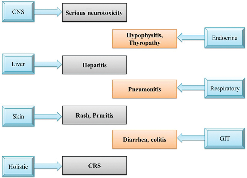 | Fig. 1 Involvement of various systems by immune- related adverse events. CNS, central nervous system; CRS, cytokine release syndrome; GIT, gastrointestinal tract.