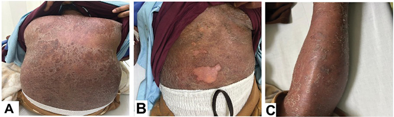 Fig 1: (A–C) Clinical images show extensive erythematous and exfoliative skin lesions involving the back, trunk, and abdomen. Clinical images demonstrate diffuse desquamation, scaling, and areas of epidermal detachment without initial mucosal involvement, consistent with a severe immune-related cutaneous adverse event mimicking toxic epidermal necrolysis.