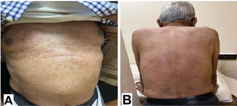 Fig 2 : (A, B) Clinical images showing diffuse erythematous, pruritic maculopapular rash over the trunk and back, involving 10–30% of BSA.