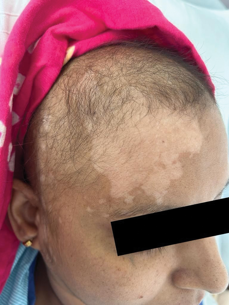 Fig 3 : Clinical image showing asymptomatic hypopigmented facial patches with diffuse frontal scalp alopecia, consistent with vitiligo-like depigmentation.