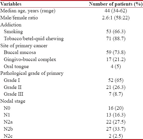 Totally 80 cases of locally advanced technically unresectable T4a OSCCs treated with IC over the mentioned time period, were retrospectively reviewed. The baseline patients' characteristics are shown in Table 1. All our patients received doublet IC with PC regimen. Majority of patients (83.8%, n = 67) received 3 cycles of IC and 8 patients (10%) received 2 cycles. Five patients (6.2%) received only 1 cycle of IC due to rapid disease progression.
