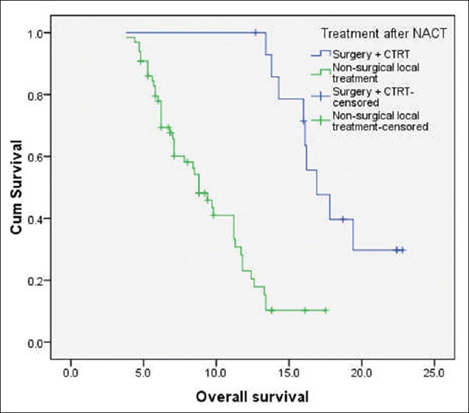 Totally 80 patients received IC, and of them 58 (72.5%) were males. Median age at diagnosis was 44 years (range, 34–62 years). All our patients received IC with doublet regimen. Majority of the patients had buccal mucosa cancers (73.8%), followed by gingivobuccal complex (21.2%) and oral tongue (5%) primaries. After IC, partial response was achieved in 17 (21.3%) patients, stable disease in 49 (61.3%) patients and disease progression was noted in 14 (17.4%) patients. Post-IC, resectability was achieved in 19 (23.8%) of 80 patients, but 4 of them did not undergo surgery due to logistic and personal reasons. The median OS of patients who underwent surgery followed by adjuvant local therapy (n = 15) was 16.9 months (95% CI: 15.2–19.8 months) and for those treated with nonsurgical local therapy (n = 65) was 8.8 months (95% CI: 6.8–10.6 months) (log-rank P = 0.000).
