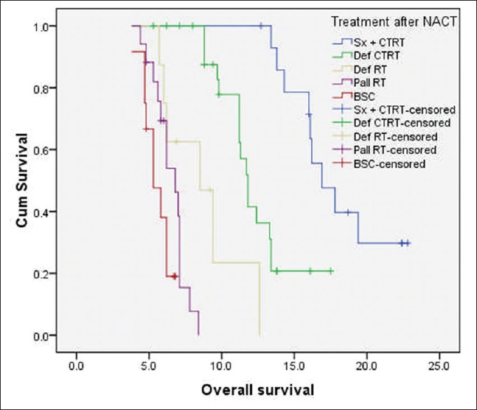 At the time of last follow-up, 49 patients (61.3%) had disease failure, either in the form of loco-regional recurrence/progression (n = 44) or as distant recurrence (n = 2) or as both (n = 3). The median PFS and OS for the whole cohort were 7.6 months and 11.2 months, respectively. The median OS of patients who underwent surgery followed by adjuvant local therapy (n = 15) was 16.9 months (95% confidence interval [CI]: 15.2-19.8 months) and for those treated with nonsurgical local therapy (n = 65) was 8.8 months (95% CI: 6.8–10.6 months) (log-rank P = 0.000) [Figure 1]. Among the 65 patients, who received nonsurgical local treatment post IC, the median OS for patients receiving definitive chemo-radiation, definitive radiation, palliative radiation and BSC were 11.8 months, 8.5 months, 6.8 months, and 5.3 months, respectively [Figure 2].