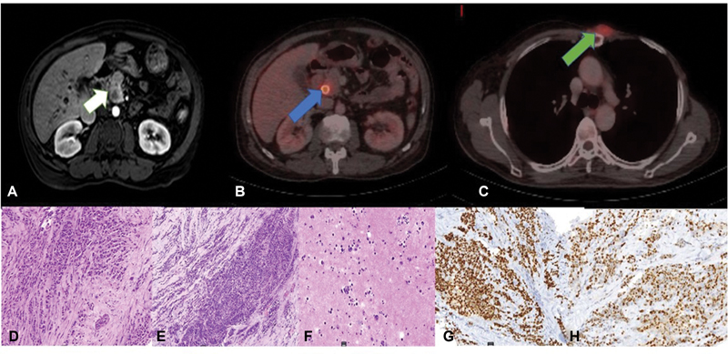 | Figure. 1 Imaging and histopathological features of recurrent lobular carcinoma: (A) Post-contrast magnetic resonance image shows a peripherally enhancing mass in the head of pancreas with moderate upstream intrahepatic biliary radical dilatation (white arrow). (B) Fused positron emission tomography computed tomography (PET/CT) shows fluorodeoxyglucose avid lesion at the head of pancreas (SUV max 7.77) with stent in situ (blue arrow). (C) Fused PET/CT shows the chest wall recurrence (SUV max 5.88) (green arrow). (D–F) Biopsy from chest wall recurrence, peritoneal nodule biopsy and peritoneal fluid cytology (hematoxylin and eosin, 20x). (G, H) Immunohistochemical markers of recurrent chest wall lesion diffuse staining for estrogen receptor and progesterone receptor.