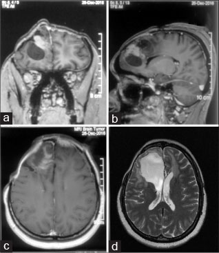| Figure 1 Contrast-enhanced coronal, sagittal, and axial view of preoperative magnetic resonance imaging showing the tumor. (d) T2 axial image of the postoperative magnetic resonance imaging showing tumor excision