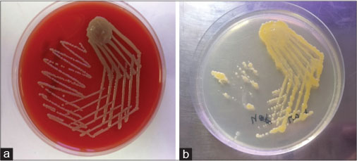 A 37-year-old female with anaplastic astrocytoma in the right frontal lobe underwent supratentorial craniectomy for a recurrent right frontal tumor in the neurosurgery department and was discharged uneventfully [Figure 1a], [b], [c], [d]. She had a history of undergoing surgery and radiotherapy for the same disease. She was planned for reradiation and rechallenge with temozolomide; however, after about a month (post-2nd surgery), she complained of fever, headache, vomiting, and neck rigidity. Her Glasgow Coma Scale = 15/15 and Karnofsky Performance Status = 70. She had a cerebrospinal fluid (CSF) leak from the operative site and a fever of 39.4°C. Laboratory investigations from peripheral blood indicated increased white blood cell (WBC) count of 14.91 × 109/L (4.0–10.0); increased absolute neutrophil count of 10.74 × 109/L (2.0–7.0) at 88.6% (40.0–80.0); decreased lymphocyte count of 0.87 × 109/L (1.0–3.0) at 5.9% (20.0–40.0); increased CSF protein = 449 mg/dL (normal: 15–45 mg/dl); lactic dehydrogenase = 250 U/L (normal: 100–190 U/L); C-reactive protein = 10.8 mg/dl (reference range: 0–0.33); and decreased CSF sugar level = 36 mg/dl (corresponding random blood sugar = 78 mg/dL). She had received day 1 of salvage temozolomide before the symptoms appeared, following which it was discontinued. Her lumbar CSF sample was sent to the microbiology laboratory for bacterial culture and drug sensitivity, blood sample for routine viral markers, malaria antigen testing, and the patient was empirically started with injection vancomycin (500 mg 6 hourly) and cefoperazone–sulbactam (2 g 12 hourly). The tests for malaria antigen detection by immune chromatographic assay were negative; dengue-NS1 antigen, IgM, and IgG antibodies were not detected. The viral markers for hepatitis B surface antigen, human immunodeficiency virus, and anti-hepatitis C virus antibodies were also nonreactive. Gram staining of CSF showed polymorphonuclear cells and Gram-negative bacilli. On culturing the CSF on blood agar and nutrient agar for 24 h, yellow-pigmented colonies with fruity odor were obtained [Figure 2a] and [b]. MacConkey agar did not show any growth. Gram staining of the colonies on blood agar suggested a pure culture of Gram-negative bacilli. Identification of the isolate was also performed on the VITEK-2 (BioMérieux, Marcy-l'Etoile, France) automated identification system, which reported Myroides spp. and its AST MIC pattern. M. odoratus was presumptively identified by performing the desferrioxamine (250 μg-disc) susceptibility testing; M. odoratus being desferrioxamine susceptible while the other species M. odoratimimus being nonsusceptible.[5] The minimum inhibitory concentrations (MICs) (μg/ml) were found to be ≥64, ≥16, ≥4, ≤4, 8, ≤8, ≤0.25, ≤0.25 μg/ml for amikacin, gentamicin, ciprofloxacin, piperacillin/tazobactam, ceftazidime, cefoperazone-sulbactam, imipenem, and meropenem, respectively. However, susceptibility interpretation is not possible due to lack of standard Clinical and Laboratory Standards Institute (CLSI) or EUCAST interpretive breakpoints for Myroides spp. These MICs and interpretation were provided by the VITEK-2 using GN AST-N 281-NLF cards. The VITEK-2 identification and susceptibility testing system has been used for non-glucose-fermenting Gram-negative bacilli (including Myroides), and the results have been found to be acceptable in a study conducted by Hsieh et al. in 2009, which reported a 100% (n = 7) concordance of GN AST-N 281-NLF cards for reporting Myroides spp. with that of conventional identification methods.[6]
