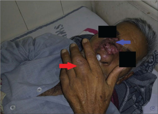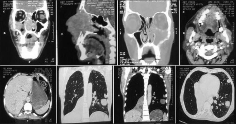 We herein report a case of a 56-year-old male, who presented to us with complaints of swelling over the nose associated with nasal blockade and discharge for past 1 year with increase in growth for past 3 months, swelling and pain in the left middle finger for past 3 months, and difficulty in breathing for past 1 month. The physical examination revealed swollen middle finger of left hand and exophytic mass replacing the nasal cavity [Figure 1]. The X-ray (anteroposterior and lateral views) of the left hand demonstrated lytic destruction of distal phalanx of middle finger [Figure 2]. The chest X-ray (posteroanterior view) demonstrated bilateral lung metastases [Figure 2], which was further confirmed by contrast-enhanced computed tomography (CECT) of thorax [Figure 3]. CECT of head and neck revealed an enhancing lesion in nasal cavity with the destruction of nasal cavity and extension into maxillary sinus and nasopharynx [Figure 3].