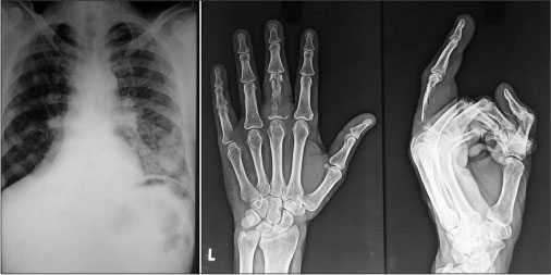 |?Figure. 2? X-ray of chest (postero-anterior view) and left hand (anteroposterior and lateral view)