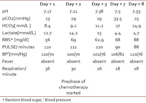 A 35-year-old male presented with intermittent fever, loss of appetite and fatigue of 5 months duration. He had weight loss of nearly 25 kg during this period. On examination, his ECOG performance status was 4. He was afebrile with a pulse of 140/min, and a respiratory rate of 36/minute. Pallor, pedal edema along with right cervical lymphadenopathy was present. On systemic examination a firm mass of 10 cm was felt in central abdomen. On evaluation, hemoglobin was 5.1 gm/dl, WBC 9200/cu mm, platelet count 2,72,000/cu mm; renal and liver functions were normal with serum (sr) urea 37 mg/dl, sr creatnine 0.7 mg/dl, sr bilirubin 0.5 mg/dl, sr SGOT 52 units/L, sr SGPT 27 units/L and sr alkaline phosphatase 260 units/L. His sr LDH was raised with a value of 876 IU/L and sr albumin was markedly low 1.8 gm/dl. His viral markers were negative. Blood gas analysis showed pH 7.17, pCO2 23 mmHg, HCO3 8.4mmol/L, serum lactate 12.7 mmol/L, suggestive of metabolic acidosis [Table 1]. Computerized tomography (CT) scan showed dilated small bowel loops with mural thickening along with the presence of homogenous mesenteric and retroperitoneal masses measuring about 7 cm along with mediastinal lymph nodes. A biopsy of the abdominal lymph node revealed NHL (subtype DLBCL), immunohistochemistry of tumor was positive for CD20 and negative for CD3 and CD10. Bone marrow was not involved by abnormal lymphoid cells. Hence, the final stage was 3BE with an IPI score of 3/5. As blood sugar, urea and creatinine were normal, blood cultures were sterile, no history of intake of metformin or other medication causing LA and other common causes of metabolic acidosis were ruled out. The patient was started on soda bicarbonate, broad spectrum antibiotics, although no focus of infection was detected. Simultaneously, he was given cyclophospamide 500 mg on day 1 and day 2, dexamethasone 8 mg three times daily day 1 to day 4 and doxorubicin 30 mg on day 3. Patient's vitals improved gradually and after 1 week, his lactate level came down along with improvement in pH and bicarbonate levels. He subsequently received six courses of R-CHOP (rituximab, cyclophospamide, doxorubicin, vincristine, prednisolone)-based chemotherapy. He had a partial response that was short lasting and developed progression of lymphoma within 2 months of sixth course of R-CHOP. He subsequently died of progressive disease. LA recurred during the latter part of his progressive disease.