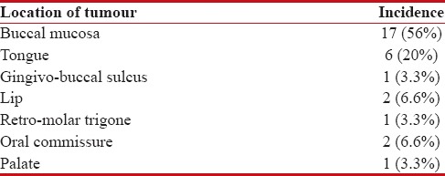 One thousand and forty-nine patients were operated for OSCC over a 10-year period. Thirty patients (2.86%) were diagnosed to have OVC during the study. Twenty-five patients (83%) were male and five (17%) were female with a male: female ratio of 5:1. The mean age at presentation was 49 years (range: 41–76 years, standard deviation 8.75). Ten patients (33.3%) with VC chewed tobacco, eight (26.6%) had chewed and smoked tobacco; three (10%) only smoked tobacco whereas the remaining nine patients did not consume tobacco in any form. The average duration of symptoms before undergoing definitive surgery for OVC was 20 months (range: 4–120 months). Distribution of primary tumors by epicenter at presentation is depicted in Table 1.