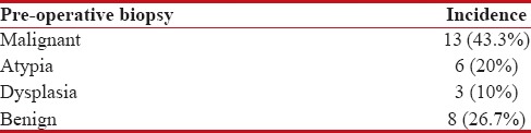 Six of the thirty patients (20%) required multiple biopsies at different time periods before undergoing wide local excision; most of the patients had a single pre-operative biopsy following which the patient underwent an oncological operation. Thirteen of the thirty patients had biopsy proven malignancy pre-operatively, atypical and dysplastic features were seen in nine patients. The rest had benign pre-operative histopathology but underwent wide local excision based on clinical suspicion [Table 2].