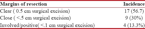 Most surgeons agree that margins are considered “close” if margins excised is <0 href="https://www.ncbi.nlm.nih.gov/pmc/articles/PMC5759063/#ref14" rid="ref14" class=" bibr popnode tag_hotlink tag_tooltip" id="__tag_659253011" role="button" aria-expanded="false" aria-haspopup="true" xss=removed>14] In the present study, close margins were present in nine patients. The patients with close margins were reviewed in the MDT postoperatively and were recommended adjuvant radiation therapy. Only one patient completed the adjuvant radiation therapy. None of them recurred. The role of adjuvant radiation therapy in OVC is reserved for patients similar to squamous cell carcinoma of the oral cavity.[1] Six of these patients were followed up with a mean follow up of 27 months. The long-term survival of these patients was however excellent with no local recurrences or disease-related mortality. This is in contradistinction to OSCC where close margins are considered to be a poor prognostic factor with recurrence rates exceeding 50%.[14,15,16] This raises the obvious question as to what margin is acceptable for OVC and whether we need to give margins of excision similar to OSCC. Whether close margins can be kept on follow-up without radiotherapy is to be discussed. Positive resection margins significantly affect local recurrence. However, the association of close margin and tumour recurrence of OVC has not been discussed in literature available.[4]