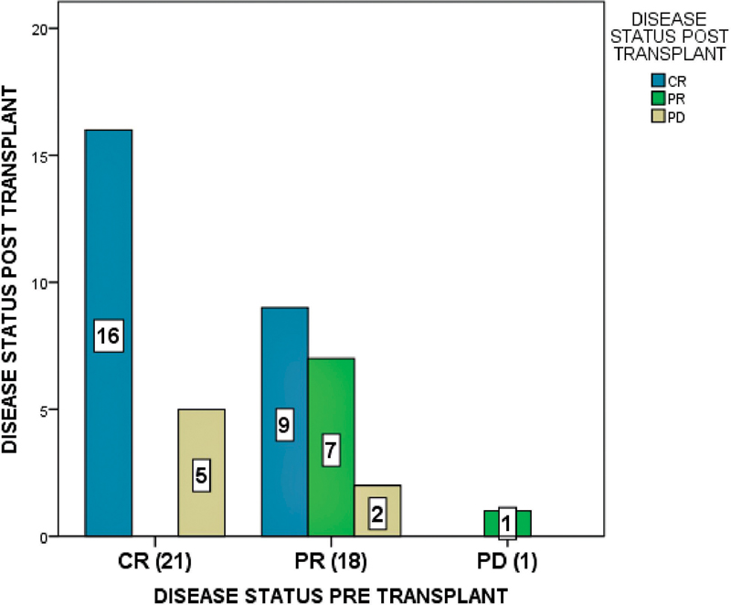 | Fig 1 Comparison of disease status pre and post-transplant in the entire cohort; CR, complete response, PR, partial response, PD, progressive disease. X axis indicates disease status pre-transplant and Y axis indicates disease status post-transplant. Among 21 patients who had CR pre transplant, 16 maintained CR, and 5 had progressive disease post-transplant. Among the 18 patients who had PR before transplant, 9 achieved CR, 7 maintained PR, and 2 had progressive disease. One patient who had progressive disease pre transplant achieved PR post-transplant.|