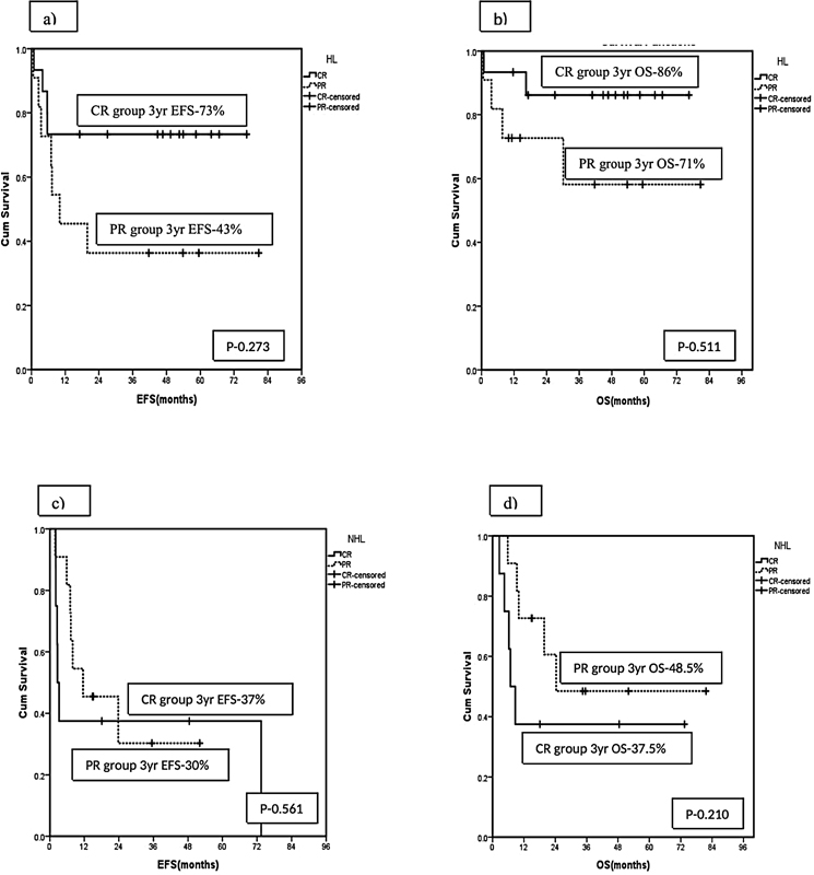 An association of survival outcomes with respect to baseline features viz. relapsed vs. refractory disease, number of lines of salvage therapy, and pre-transplant disease status, complete response vs. partial response is shown in [Supplementary Tables S1] and [S2]. A comparison of survival outcomes based on the pre-transplant disease status of CR vs. PR in subgroups of HL and NHL, respectively, is shown in [Fig. 2].