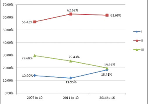 |?Figure. 1? Line chart depicting the changing trends in breast cancer stage over 10 years at our center|