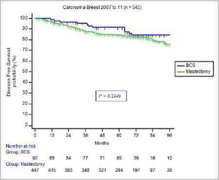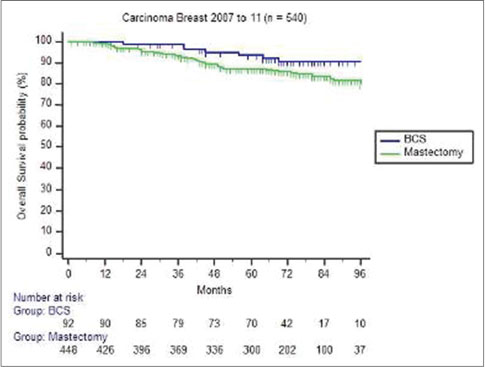Patients who underwent BCT did better than patients who had mastectomy although not statistically significant [Figure 2] and [3].