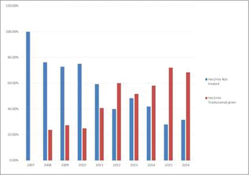 |?Figure. 5?Graph depicting the gradual increase in the number of patients who received Trastuzumab over a decade