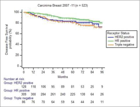 |?Figure. 6?Five years disease-free survival in receptor positive, Her2 positive, and triple negative breast cancer patients