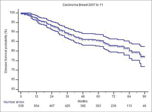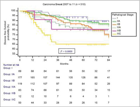 Prospectively collected data from January 2007 to December 2016 were analyzed. Clinicopathological details such as age, tumor size, grade, stage, hormone receptors and Her2 status, treatment variables such as breast conservation therapy (BCT) rates, sentinel lymph node biopsy (SLNB), and survival outcomes were analyzed. Survival analysis was done using the Kaplan?Meier curves for patients treated from 2007 to 2011, for they had a median follow-up of 70 months.