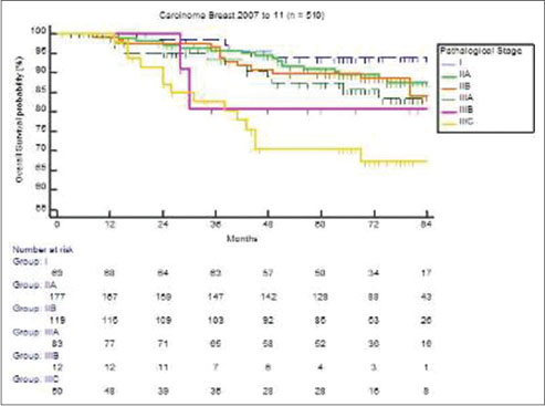 A review of published studies has reported a very low 5 years survival rate ranging from 40% to 45%. Raina?et al. (OS 73% and DFS 78%) and Dinshaw?et al. (OS 87% and DFS 76%) reported higher survival rates in patients with early breast cancer. In our study population, the 5 years OS is 88.3%, and DFS is 85.7%. Node-negative patients, and hormone receptor-positive patients did better than node negative and receptor-negative patients. Patients who underwent BCT did better than those with mastectomy. Triple-negative patients did worse than nontriple-negative patients [Figure 7], [8], [9], [10].