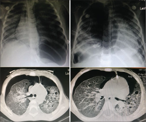 In the PICU, she was intubated and started on mechanical ventilation and supportive care. She developed bilateral pneumothoraces requiring intercostal drainage tubes. Following extubation considering the nonresolution of symptoms and unusual occurrence of pneumothorax in a child with miliary tuberculosis, a chest computed tomography (CT) was performed [Figure 1]. This revealed multiple nodules and thin-walled cysts all over both lungs. Many cysts were subpleural. This characteristic radiological picture suggested LCH. Closed lung biopsy was attempted, but the biopsy findings were noncontributory. The child continued to have respiratory distress and oxygen requirement with bilateral extensive coarse crepitations. She had multiple episodes of worsening of respiratory distress with increased oxygen requirement due to repeated episodes of fresh pneumothoraces on both sides. Besides her respiratory symptoms and signs, she had no other findings to suggest LCH of other organs. Evaluation of blood counts, skeletal survey, and liver function tests was all normal. Considering the typical radiological findings of LCH, the plan was to give her a trial of chemotherapy as per the LCH III protocol (Vinblastine and prednisolone). She was also started on intensive nutritional supplementation. After 2 weeks of therapy, her general condition had not significantly improved and she continued to have episodes of pneumothorax requiring new intercostal draining tubes. In consultation with pulmonary medicine, therapeutic pleurodesis was planned with povidone-iodine. She was given two doses of povidone-iodine on both sides and tolerated the treatment well. After 4 weeks of chemotherapy, her oxygen requirement had reduced and intercostal drain tubes were removed. She tolerated this well with no recurrence of pneumothorax. Her interval assessment at 6 weeks showed a significant improvement in the lung parenchyma but the persistence of few nodules and cysts [Figure 2]. A second 6-week induction course of chemotherapy was administered followed by maintenance chemotherapy for 6 months. She is currently well with no respiratory signs and symptoms with lung imaging showing no nodules or cysts. She has gained weight and has no active disease on follow-up.