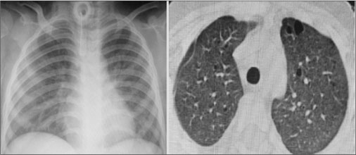 A 5-year-old girl from rural South India presented to the Pediatric Intensive Care Unit (PICU) of our institution in respiratory failure. She had been treated at two other pediatric units for progressive respiratory distress and fever for the past 1 month. The symptoms of fever and respiratory distress had been insidious in onset and had progressed over 2-month interval. Short courses of antibiotics had not improved her symptoms. Based on her worsening respiratory distress and chest X-ray findings which were interpreted as miliary tuberculosis, she had been started on antitubercular treatment before referral. As her symptoms did not improve on antitubercular treatment and her respiratory distress worsened, she was referred to our PICU for ventilator support.