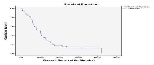 The overall estimated median EFS was 5.78 months (range 4.67–6.89 months) [Figure 1]. The overall estimated median OS in our study was 10.05 months (range 7.31–12.79) [Figure 2]. None of the factors evaluated as prognostic factors for OS including ECOG PS (0–1 vs. ≥2), age (<65 xss=removed>P = 0.125) [Supplement Table 1].