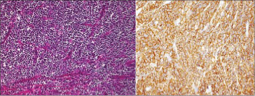 |?Figure. 1? Paraffin block of small bowel mass showed intermediate-sized, noncleaved, lymphoid cells with high proliferation rate suggestive of Non-Hodgkin?s lymphoma of Burkitt type with Mib proliferative index of 100%